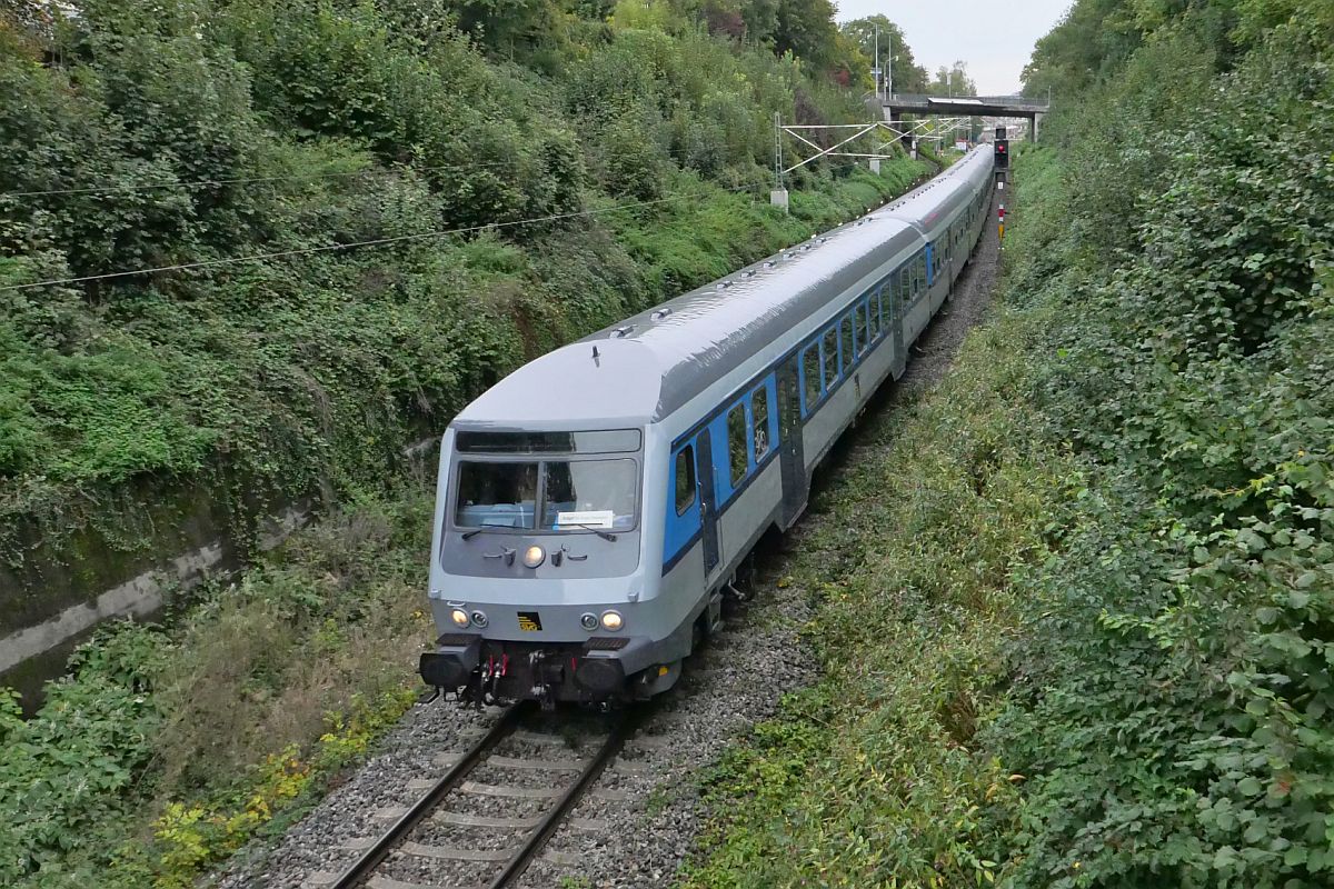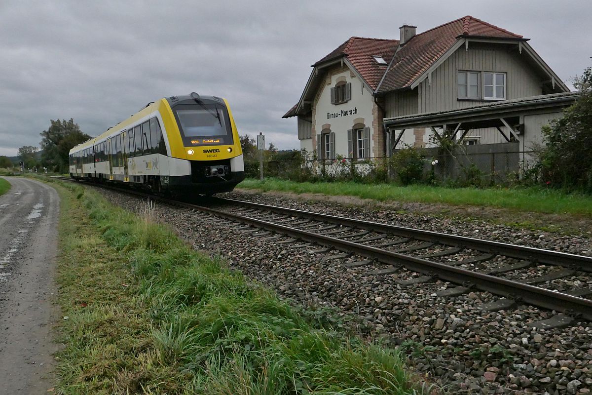 Nicht wie bisher mit Lok sondern mit Steuerwagen voraus passiert der von Singen (Htw) nach Stuttgart fahrende SVG 19932 die Haltestelle Friedrichshafen-Manzell (21.05.2023) Jürgen Vos
