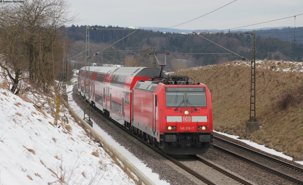 146 225-8 "Baden-Württemberg erfahren" zieht zusammen mit 146 201 (am Zugende) den RE 19044 (Rottweil-Stuttgart). Aufgenommen am 16.03.2013. Wegen Verzögerung im Betriebsablauf hatte der Zug etwa 35 Minuten Verspätung. Gregor Kaercher
