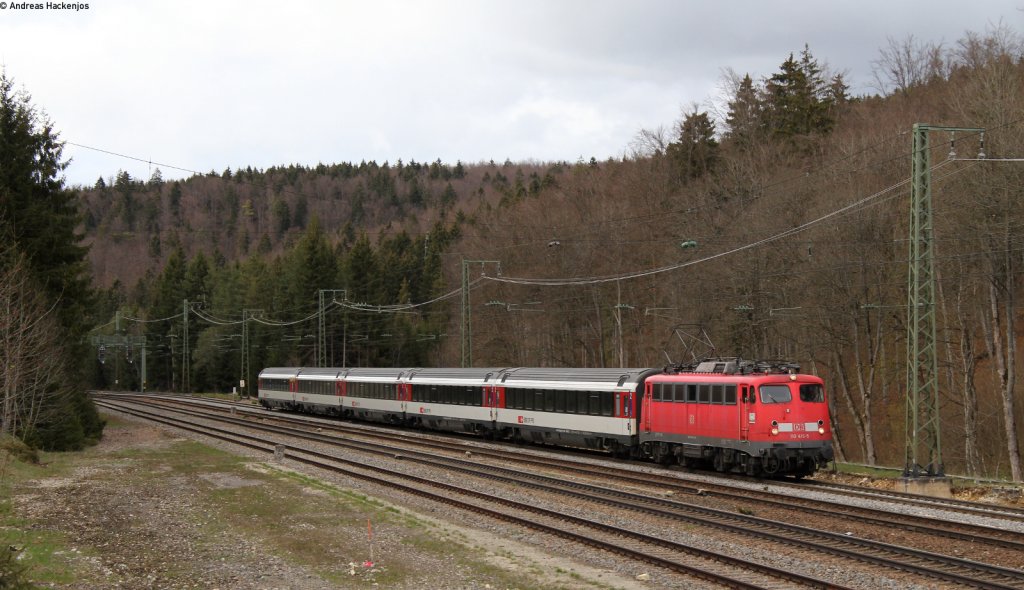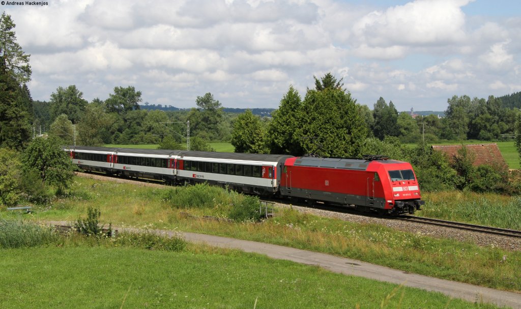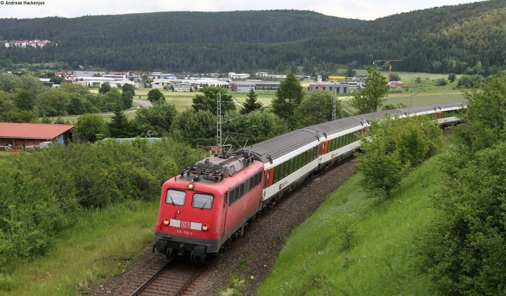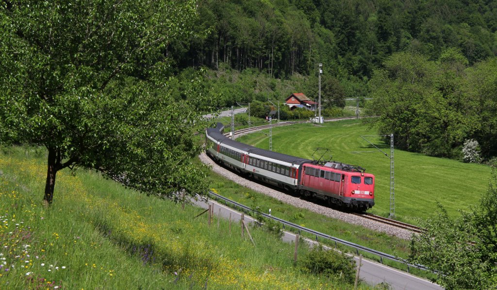 Sommertag im Hegau. Zum Schluss gab es noch Erlesenes. Hier durfte wie in alten Tagen wieder mal eine "110er" ihre Tatkraft unter Beweis stellen. 115 198 quält sich mit einem IC gleich die Engener Steige hinauf zur Wasserscheide. Hier fährt die Gäubahn noch auf den Gleisen der Schwarzwaldbahn. Im Hintergrund der eher unscheinbare Mägdeberg, wie alle anderen Hegauvulkane auch von einer Burgruine gekrönt. Welschingen im Juli 2012. Irgendwie sortiert sich das Bild nur widerwillig in die Kategorie Baureihe 115... Olli