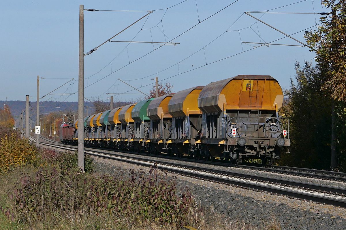 Ein aus 11 Schüttgutwagen und zwei offenen Güterwagen gebildeter Güterzug am 29.10.2021 bei Gäufelden in Fahrtrichtung Stuttgart