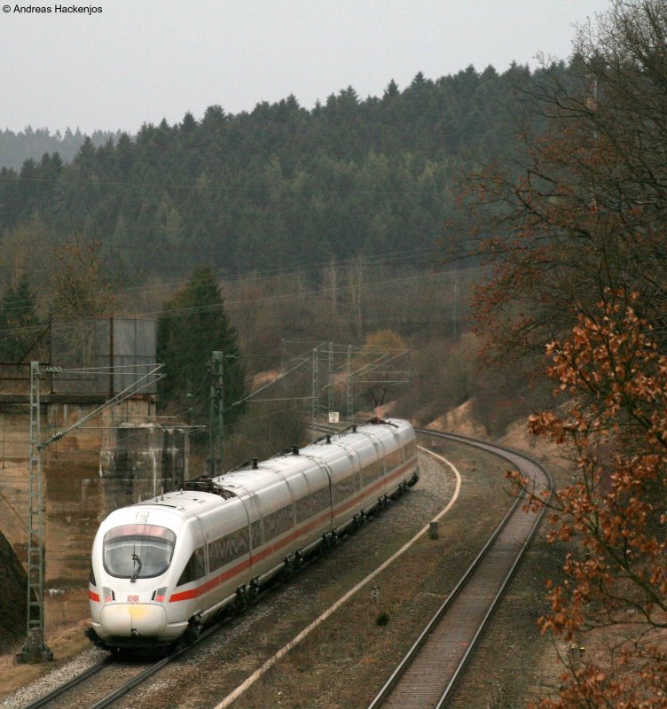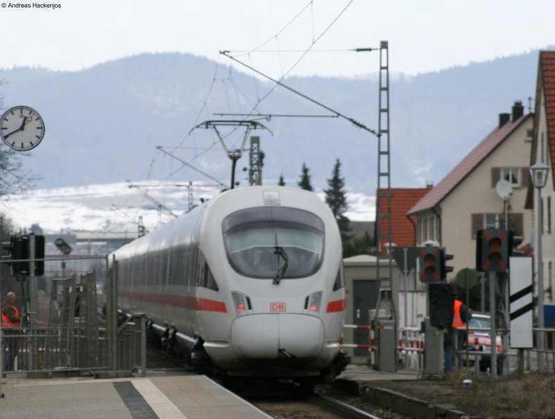 411 082-1 "Mainz" als ICE280 (Zürich HB-Stuttgart Hbf) bei der Durchfahrt Weilheim(Württ) 15.3.09 Der Bü ist nun schon ein TV Star da dort der Umbau shcon 3 Jahren dauert bzw seit 3 Jahren das Flatterband hängt