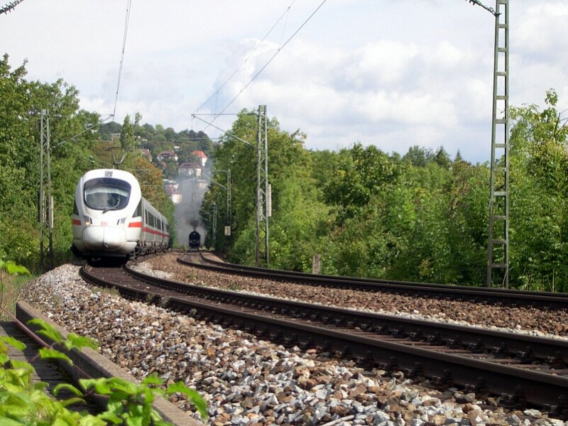 125 Jahre Gäubahn - In der Nähe des Westbahnhofes von Stuttgart fand am Mittag des 12.09.2004 eine Begegnung von Generationen statt. ICE 185 Stuttgart - Zürich überholt den auf dem Gegengleis fahrenden Extrazug nach Stuttgart - Vaihingen, der mit 50 3636 der GES bespannt ist.