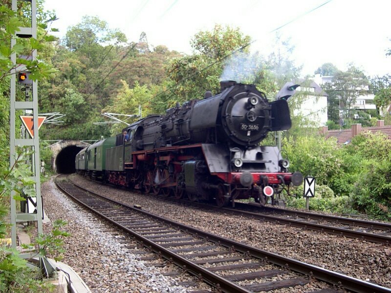 125 Jahre Gäubahn - Kurz vor dem Stuttgarter Westbahnhof ist der Extrazug der GES mit 50 3636 am 12.09.2004 in Richtung Hauptbahnhof unterwegs. Hinten ist der Hasenbergtunnel zu sehen.
