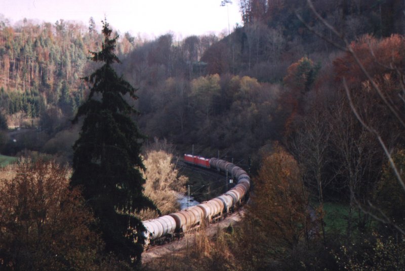 Eine Doppeltraktion zweier BR 189 ziehen hier einen schweren Güterzug, bestehend aus etlichen Kesselwagen (Öl oder Kerosin), durch das Neckartal zwischen Talhausen und dem Hohensteintunnel.