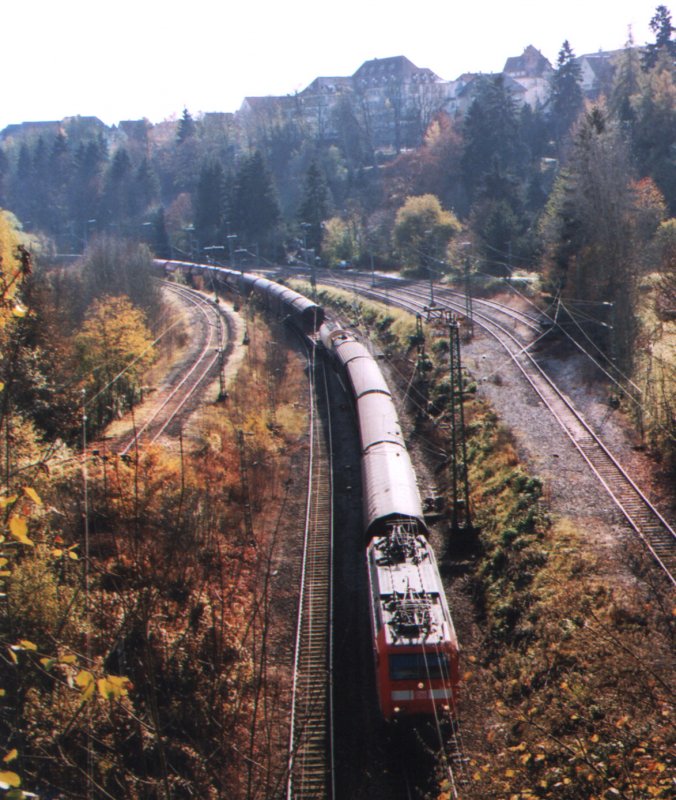 Über dem Au-Tunnel in Rottweil blickt man hier auf das Gleisfeld und auf die oberhalb befindliche Altstadt. In diesem Moment macht sich ein langer Gütertransport auf den Weg nach Norden, nach Kornwestheim.