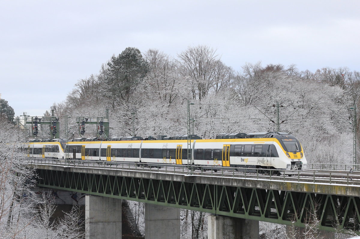 AM 18.12.2017 überquert 442 203 mit einem weiteren Triebzug seiner Gattung als RE Rottweil/Freudenstadt-Stuttgart den Nesenbachviadukt zwischen Stuttgart-Vaihingen und Österfeld. Fluffy