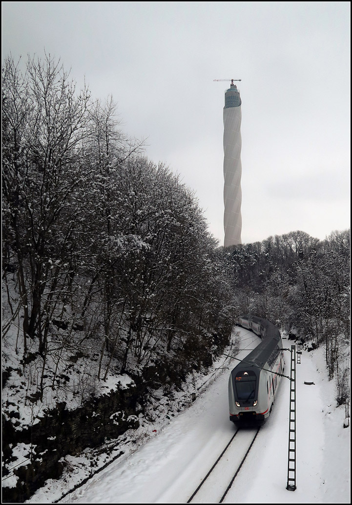 Vermutlich ist der Güterzug länger als der Aufzugstestturm von Rottweil hoch ist. Blick von der Altstadt Rottweil hinunter ins Neckartal und hinüber zum neuen Wahrzeichen der Stadt. Links ist teilweise der Pulverturm zu sehen. Von der Altstadt zum Turm soll über dem Tal zudem die längste Fußgängerhängebrücke der Welt gebaut werden.