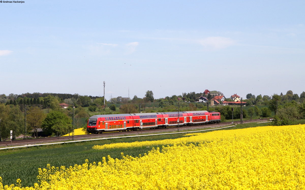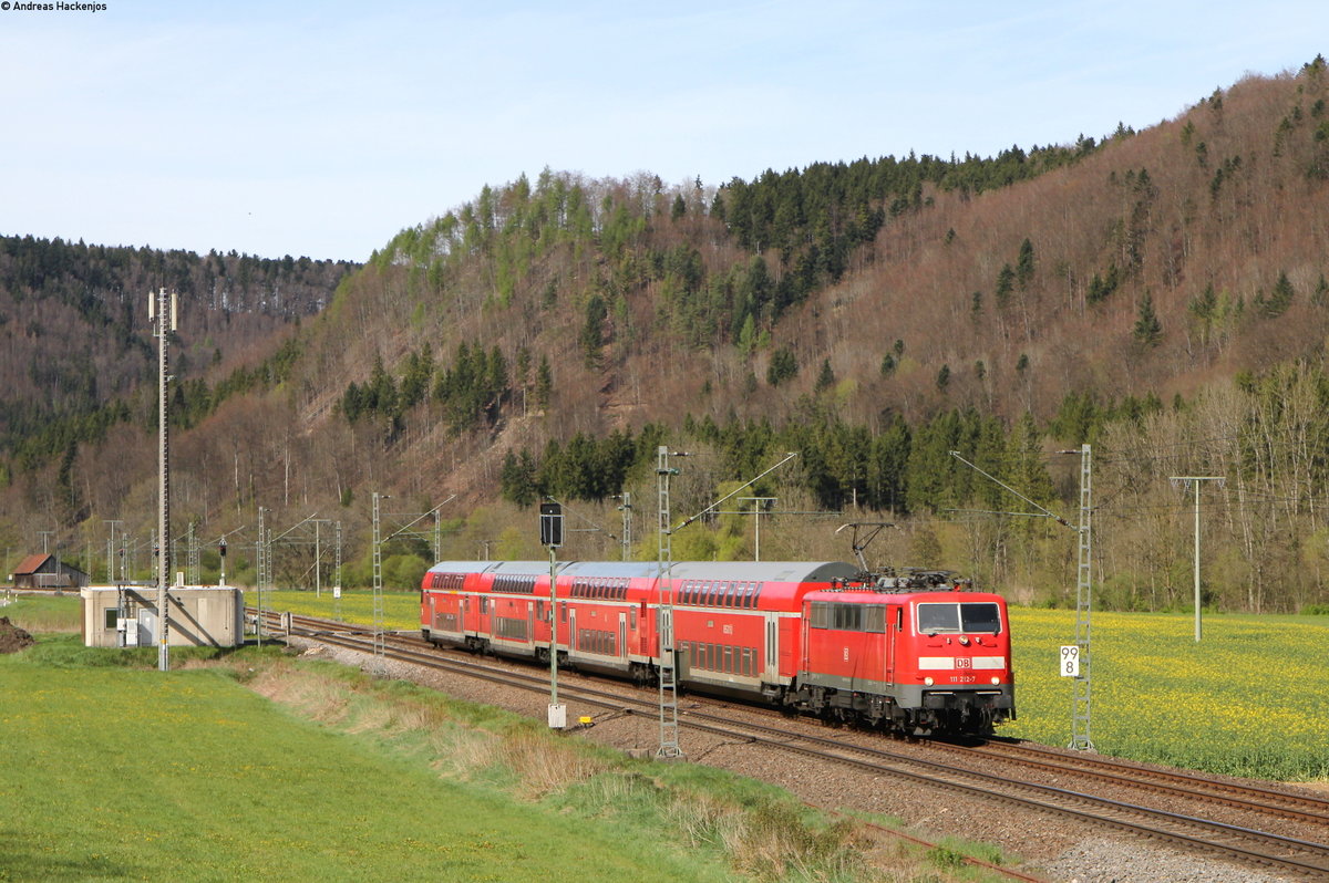 Auf die nach Plan fahrenden Personenzüge fixiert wurde bei der Suche nach einem neuen Fotostandort eine Brücke überquert und dabei ein plötzlich herannahender Güterzug gesichtet. Da blieb nur noch Zeit für einen Notschuss auf die Richtung Singen fahrende 185 196-3 mit Silowagen am 06.05.2017 bei Welschingen. Jürgen Vos