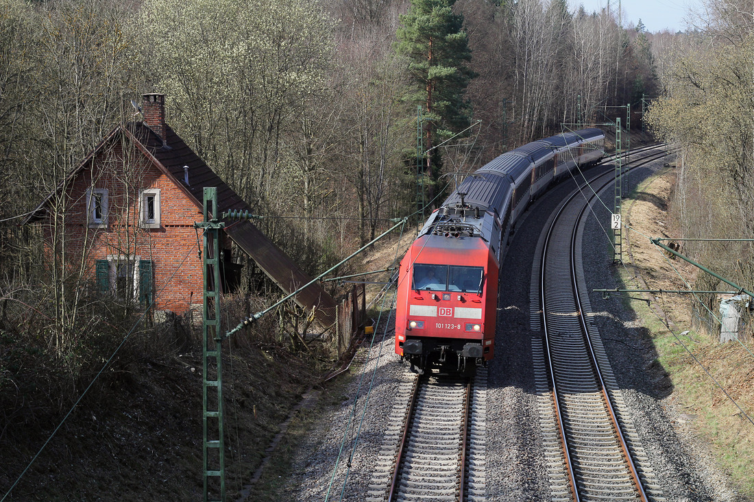 101 123 mit einem IC von Zürich nach Stuttgart, fotografiert am 26. März 2017. Das Bild wurde von einer Brücke zwischen Stuttgart-Rohr und Goldberg aufgenommen.