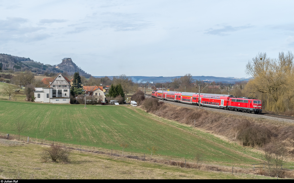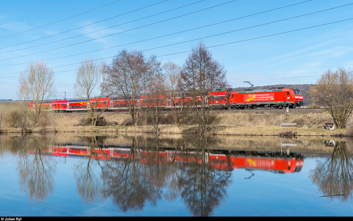 111 076 erstrahlt anders als viele ihrer ausgebleichten Schwestern im schönsten rot als sie am 11. März 2017 mit einem RE Stuttgart - Singen zwischen Welschingen-Neuhausen und Mühlhausen (Engen) unterwegs ist.