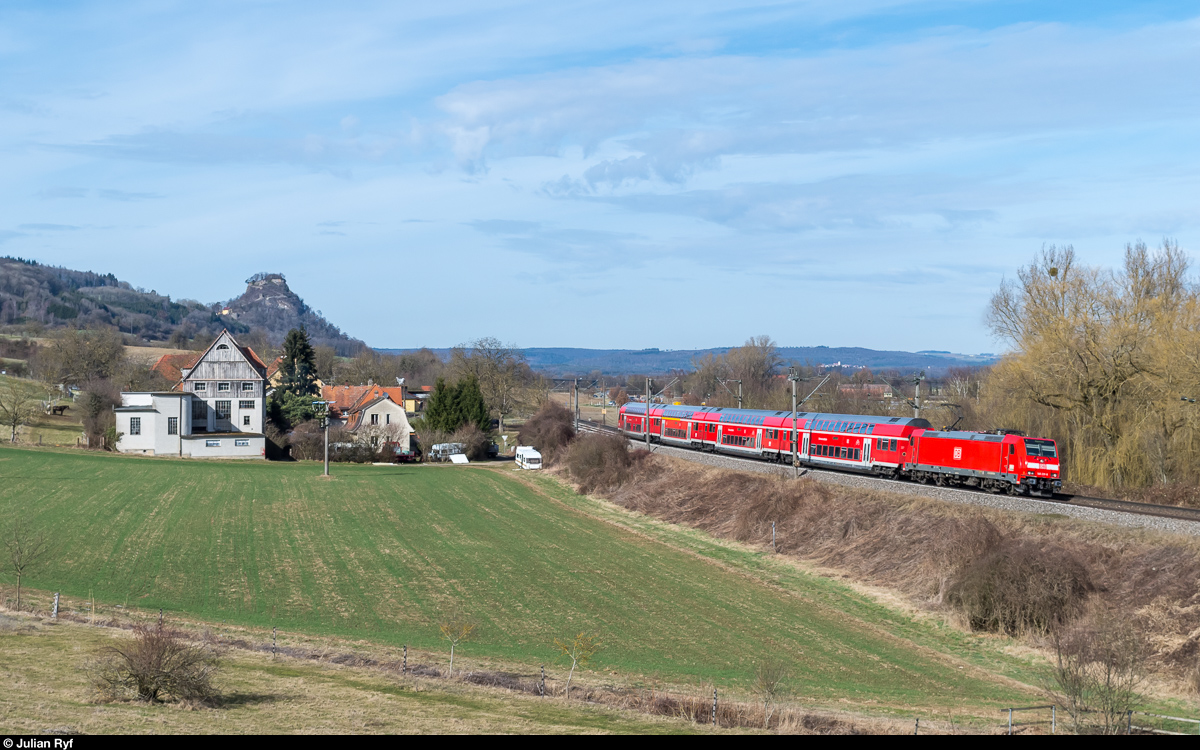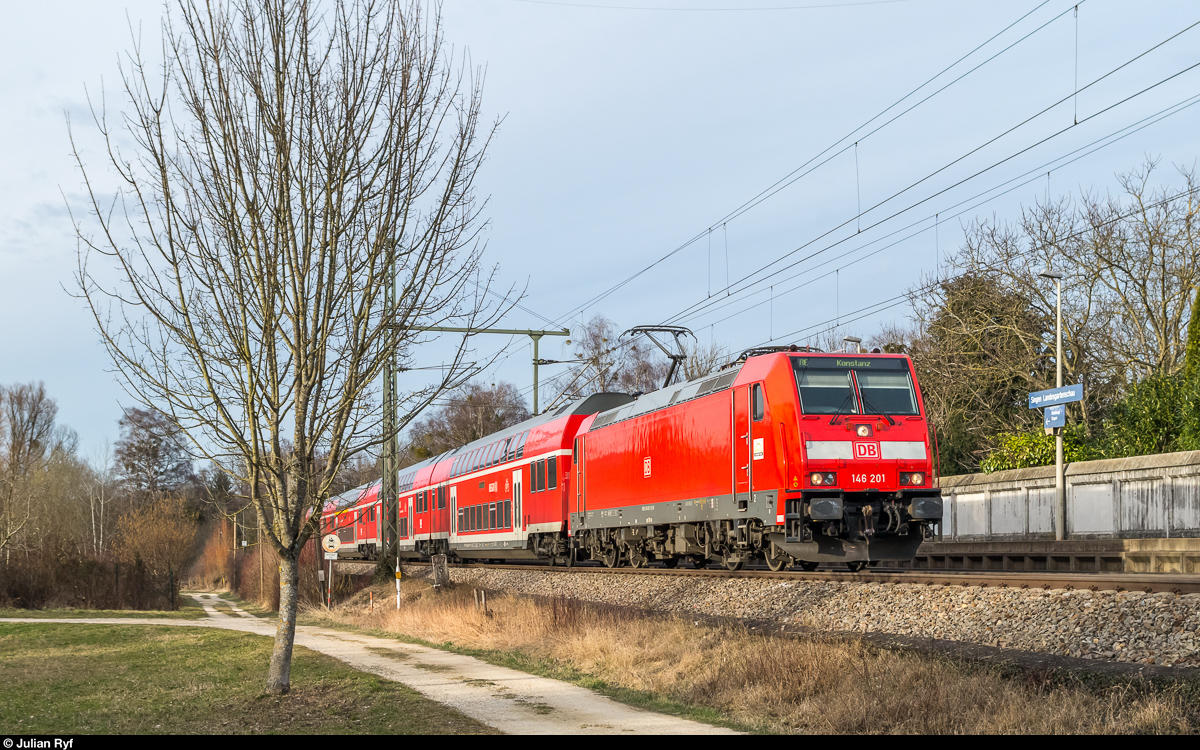 146 231 ist am 11. März 2017 mit einem RE Karlsruhe - Konstanz kurz vor Singen unterwegs. Im Hintergrund ist der Hohenkrähen mit der gleichnamigen Burgruine zu sehen.