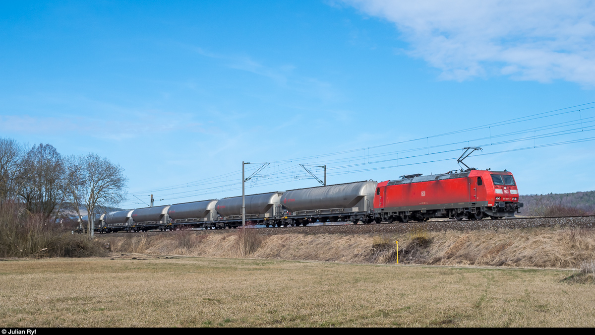 Etwas überraschend für mich kam am 11. März 2017 die 185 180 zwischen Welschingen-Neuhausen und Mühlhausen (Engen) mit einem Güterzug angefahren. Die Stelle daher leider nicht ideal für den recht langen Ganzzug.