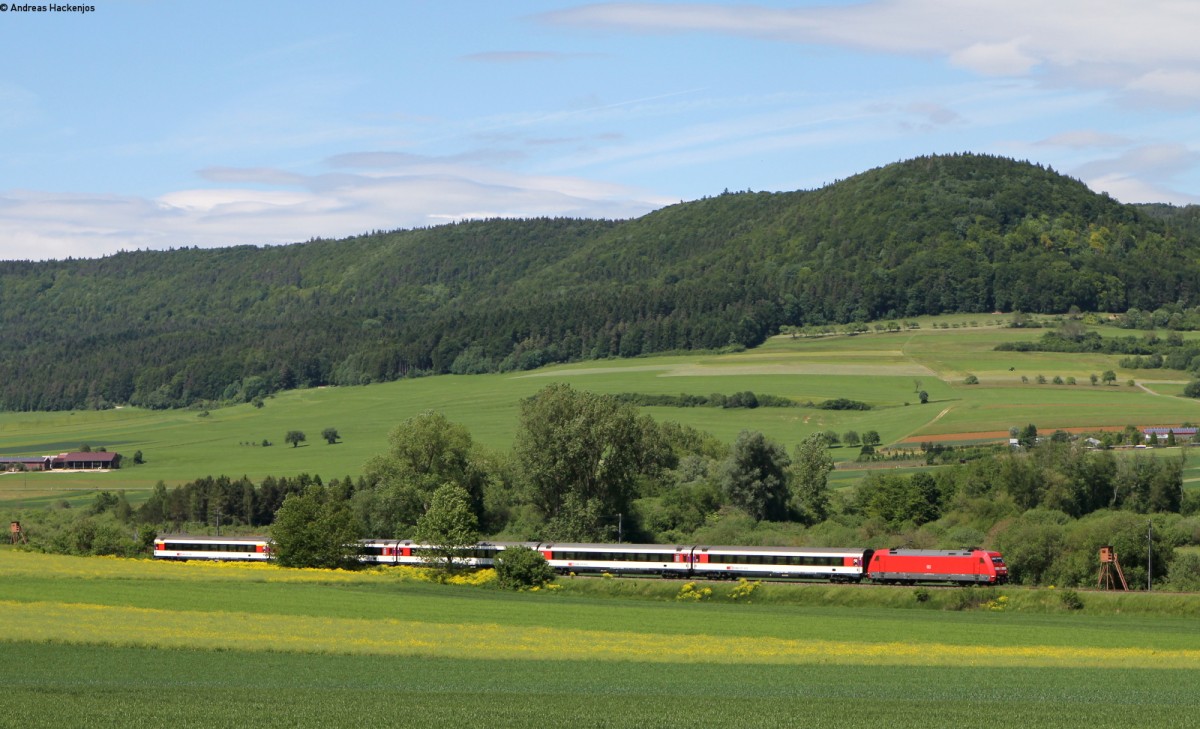 Bei der Haltestelle Singen Landesgartenschau zieht 120 130-0 am 30.05.2015 den letzten IC des Tages aus Richtung Stuttgart nach Singen, wo eine Re 4/4 II die Weiterfahrt nach Zürich übernehmen wird. Jürgen Vos