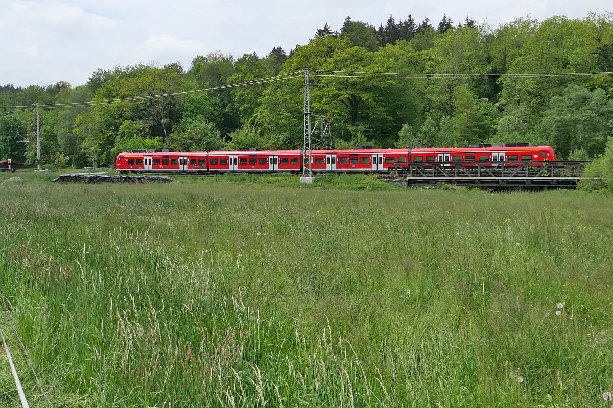 Als RB 91 / 87598 von Friedrichshafen Hafen nach Aulendorf haben 426 542-7 und ein unerkannt gebliebener Triebwagen der "Bodensee-Oberschwaben-Bahn" zwischen Ravensburg und Aulendorf einen Fußgängerbahnübergang im Schussentobel bei Kilometer 162.4 passiert (25.06.2023) Jürgen Vos