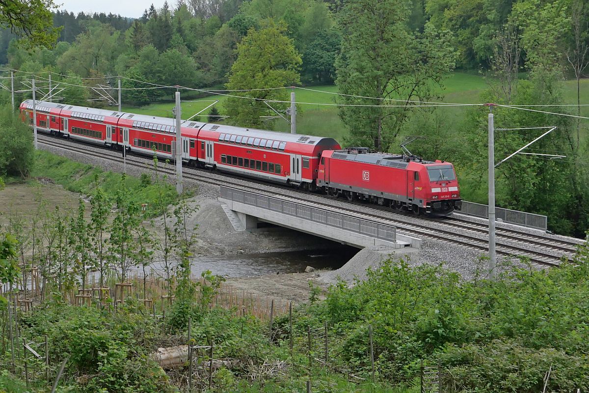Brücke im Schussentobel bei Kilometer 162.0, nachher# - Am 20.05.2023 überquert 146 211-8 mit den Wagen des RE 5 / 4216, Friedrichshafen Stadt - Stuttgart, die Schussen auf einer 2022 gebauten Walzträger-in-Beton-Brücke Jürgen Vos