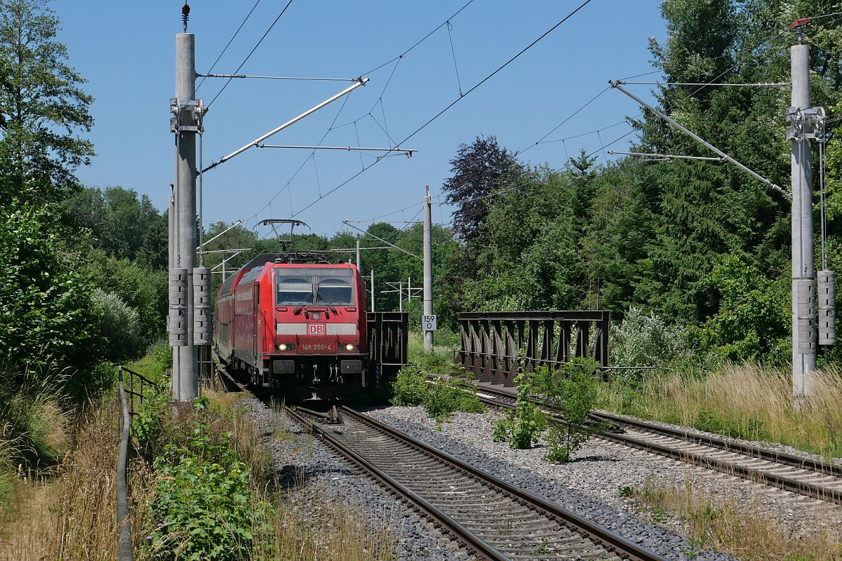 Kurz nach der Abfahrt in Aulendorf überquert am 25.06.2023 146 208-4 mit den Wagen des RE 5 / 4213, Stuttgart - Friedrichshafen, im Schussentobel bei Kilometer 159.0 die Schussen zum zweiten von insgesamt sieben Mal Jürgen Vos