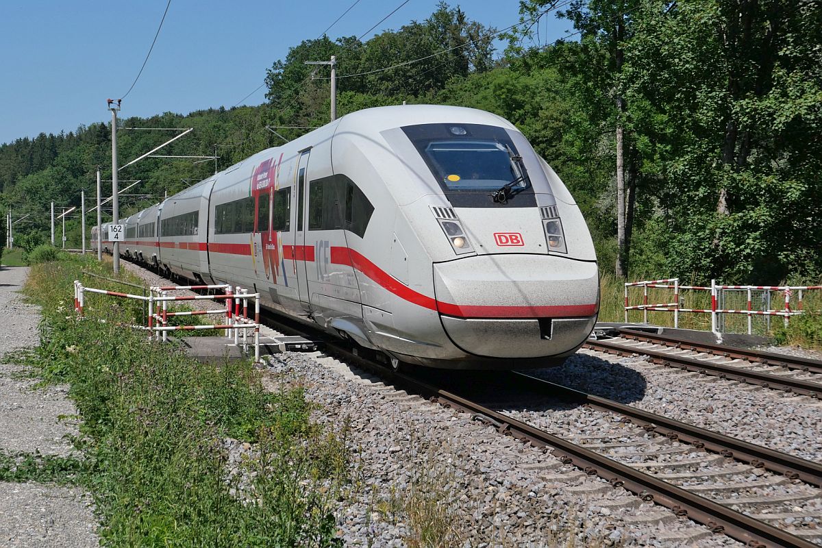 Kurz vor der Durchfahrt des Bahnhofs von Aulendorf befindet 812 203-4 als ICE 118, Innsbruck - Dortmund, am 25.06.2023 im Schussentobel bei Kilometer 159.2 Jürgen Vos