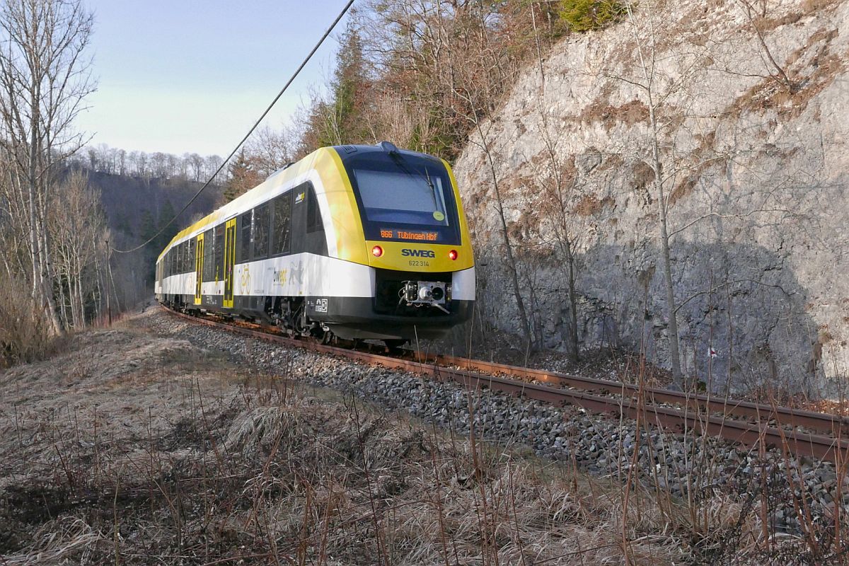 Auf der Fahrt von Sigmaringen nach Tübingen hat 622 314 am 08.03.2021 als RB 66 / HzL 86272 kurz zuvor das Donautal verlassen und befindet sich hier bei der Einfahrt in das Schmeiental.