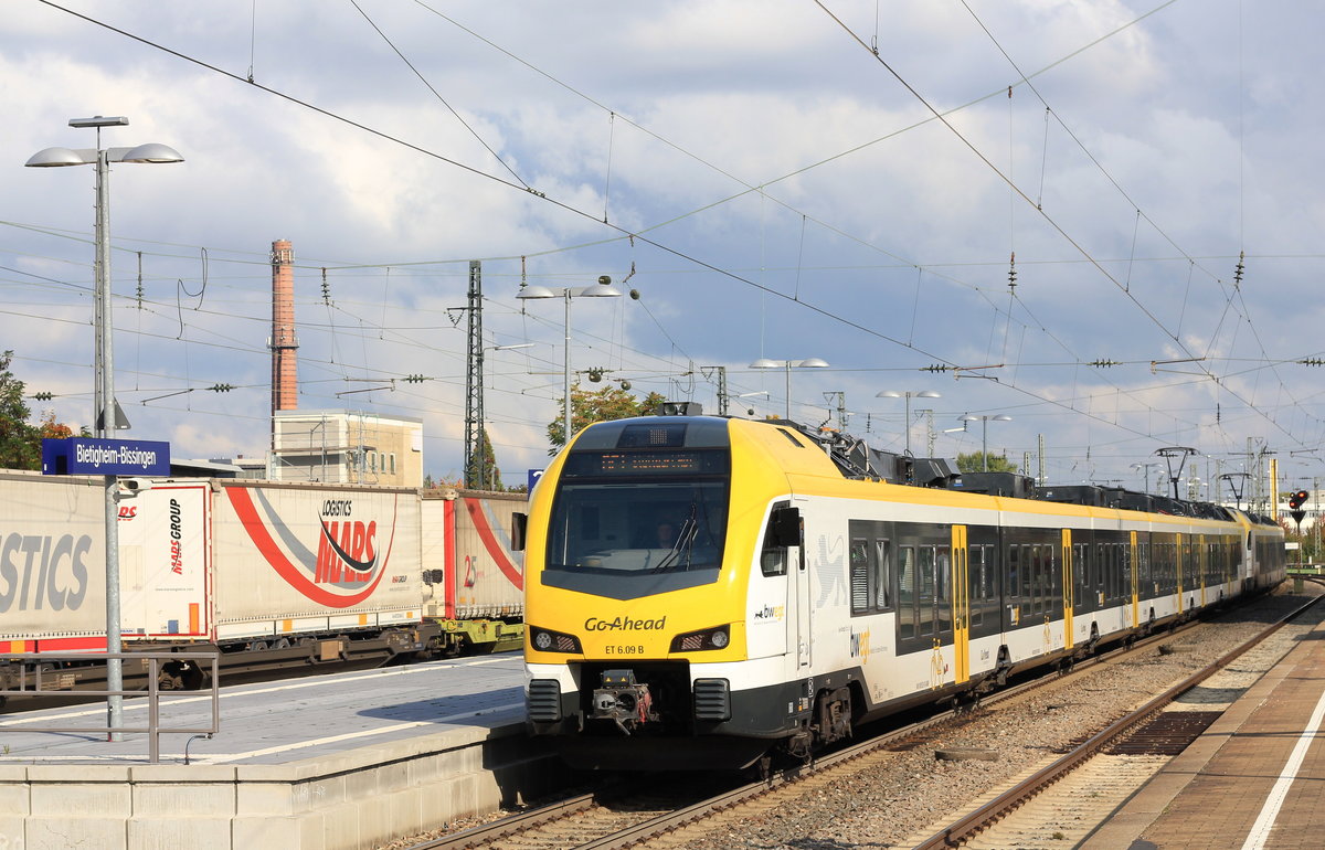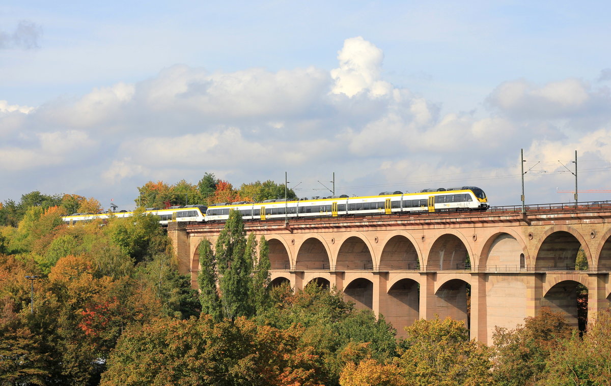 Die Lackierung in den baden-württembergischen Landesfarben steht den Elektrotriebwagen, wie diesem sechsteiligen Flirt, ausgesprochen gut 🧰 Go-Ahead Baden-Württemberg GmbH 🚝 RE 8 (19071) Würzburg - Stuttgart 🚩 Bahnstrecke KBS 770 (Residenzbahn) 🕓 9.10.2020 | 15:44 Uhr