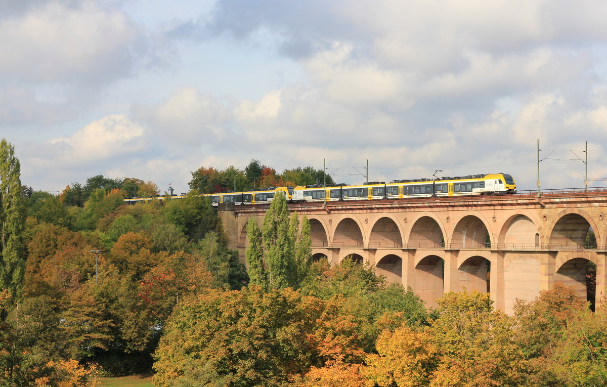 Mit ordentlicher Verspätung passiert ein Bombardier Talent 2 der Abellio Rail BW das unter Denkmalschutz stehende Areal der ehemaligen Schuhfabrik Salamander in Kornwestheim 🧰 Abellio Rail Baden-Württemberg GmbH 🚝 RB 18 (19329) Osterburken - Tübingen 🚩 Bahnstrecke KBS 770 (Residenzbahn) 🕓 12.10.2020 | 17:23 Uhr