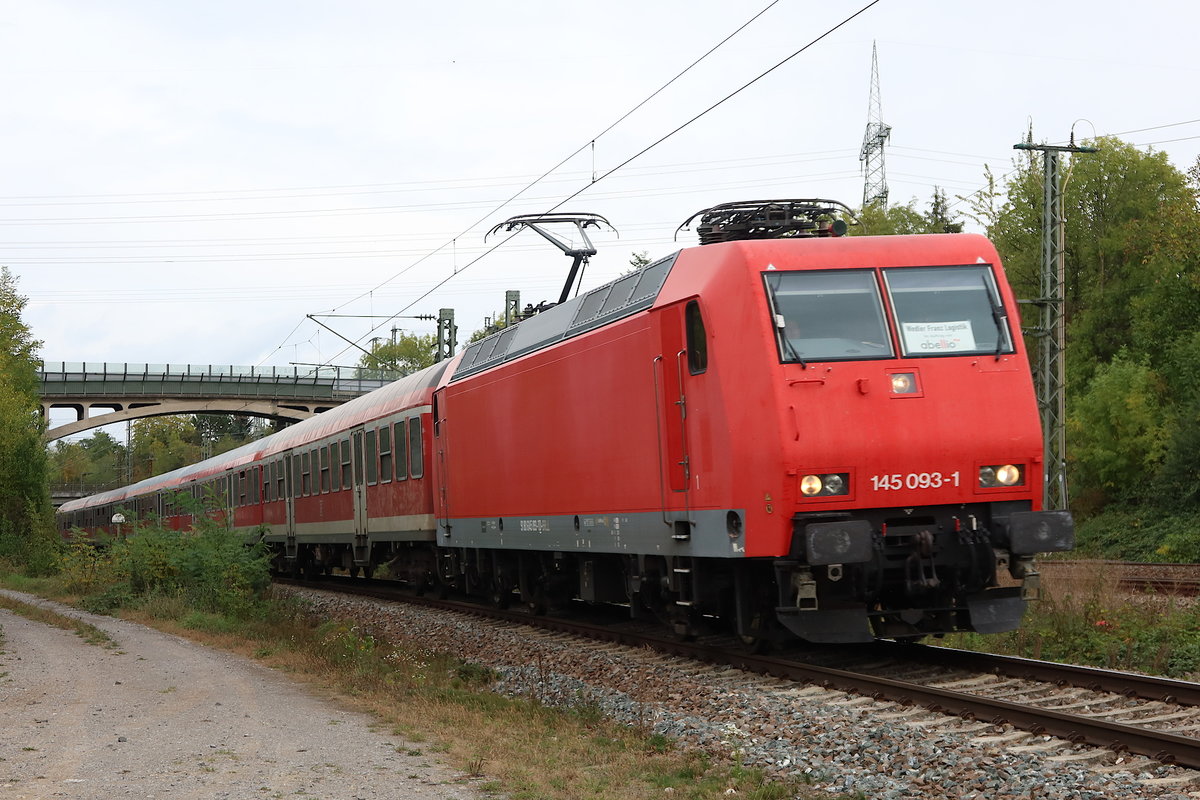 Kein optisches Highlight ist die schlichte 145 093-1 vor einem Reginalzug bei Stuttgart-Stammheim 🧰 Abellio Rail Baden-Württemberg GmbH 🚝 RE 10a (95869) Heilbronn - Tübingen 🚩 Bahnstrecke KBS 770 (Residenzbahn) 🕓 9.10.2020 | 15:38 Uhr