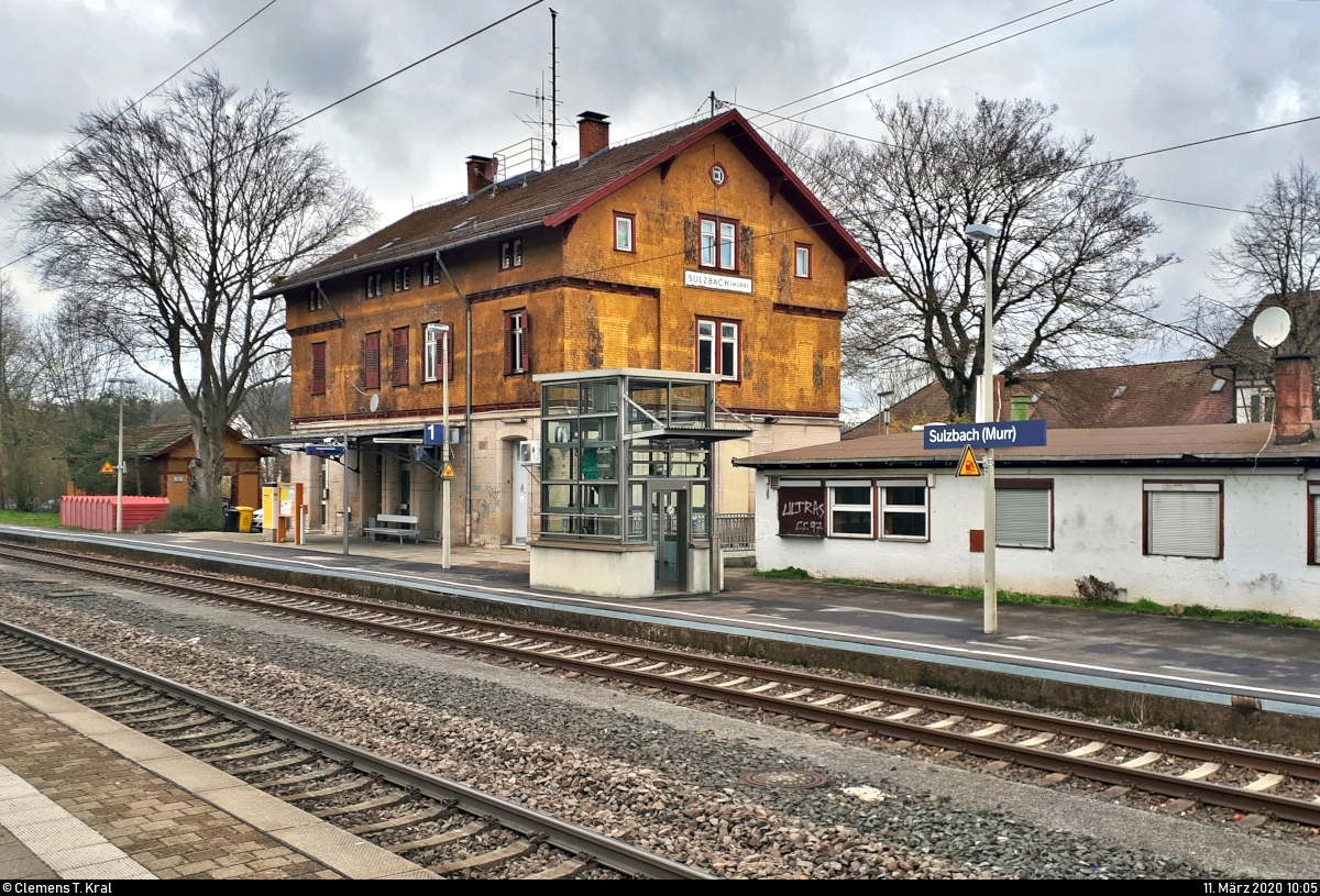 Blick auf das Empfangsgebäude des Bahnhofs Sulzbach(Murr) auf der Bahnstrecke Waiblingen–Schwäbisch Hall-Hessental (Murrbahn | KBS 785).
