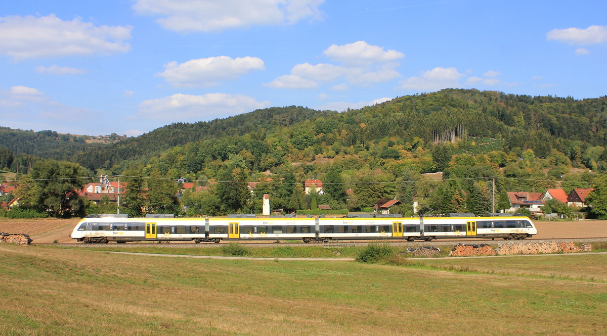 Bevor meine S-Bahn auf Gleis 3 einfahren wird, verlässt ein Talent 2-Triebzug der DB auf Gleis 2 den Bahnhof Winnenden in Richtung Schwäbisch Hall-Hessental.