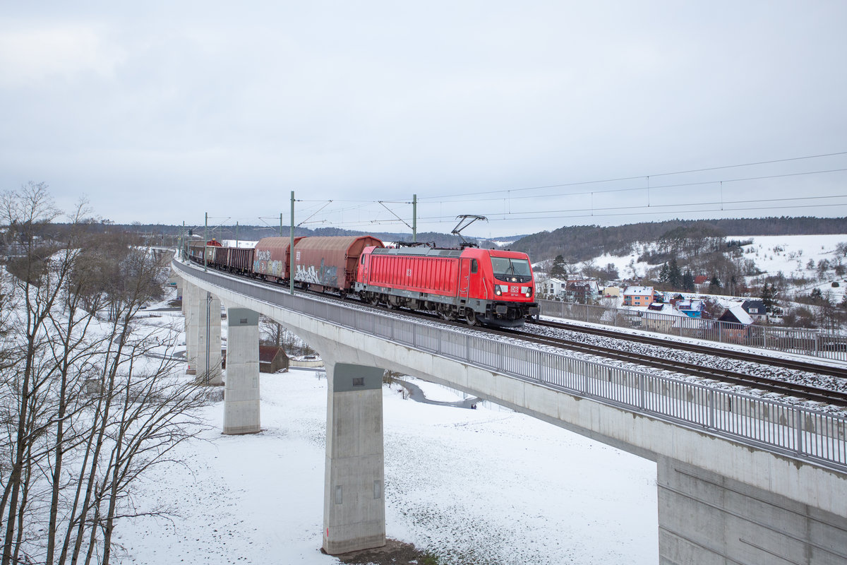 Ungeplante Umleitung: Wegen Brückenbauarbeiten zwischen Winterhausen und Ochsenfurt war die Bahnstrecke Würzburg – Ansbach am Wochenende vom 28.03. abends bis 31.03.2025 morgens gesperrt. Fern- und Güterzüge wurden deshalb über Nürnberg umgeleitet und der Nahverkehr (RE 80 Arverio Bayern) zwischen Würzburg und Ochsenfurt im Schienenersatzverkehr (SEV) gefahren. Eigentlich sollte die Strecke ab Montag 5 Uhr wieder befahrbar sein. Die Bauarbeiten wurden jedoch nicht rechtzeitig fertig, s. d. die Sperrung am selben Tag bis ca. 15 Uhr andauerte!  Der Intercity 2083/2082 „Königssee“ musste dementsprechend weiterhin über Nürnberg umgeleitet werden. Am Nachmittag konnte die ungeplant umgeleitete Elektrolok DB 101 136-0 mit dem 40 Minuten verspäteten IC 2082 in Kitzingen fotografiert.