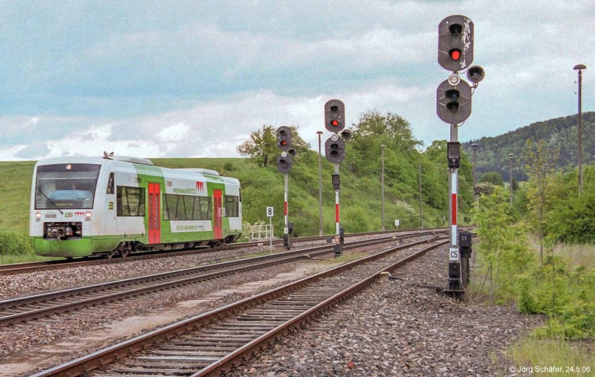 Als der VT 102 der Südthüringenbahn am 24.5.06 in Untermaßfeld einfuhr, stand das Form-Ausfahrsignal Richtung Meiningen noch. Eine Weichenverbindung zum Gleis nach Ritschenhausen am linken Bildrand gab es hier jedoch nie. Jörg Schäfer