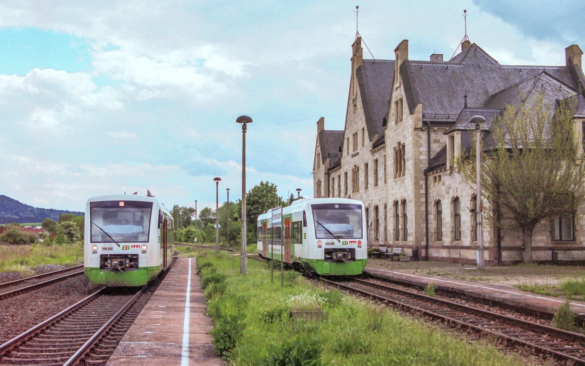 Nördlich von Ritschenhausen trennen sich die Gleise nach Grimmenthal (links) und Meiningen (rechts). VT 024 der Erfurter Bahn steuerte am 24.5.06 die Werrastadt an. Jörg Schäfer