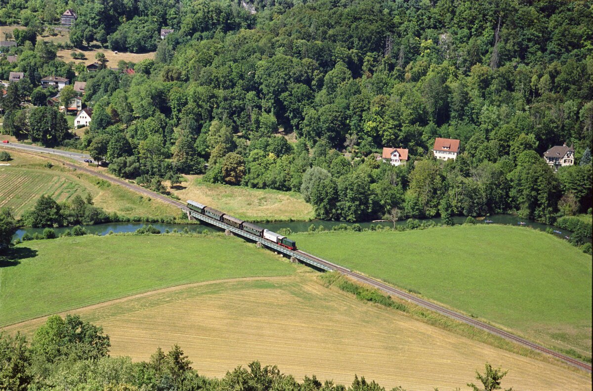 Am 16.6.1986 befuhr ein Sonderzug, bespannt mit  V 80 002  und leider mit einem unpassenden Verstärkungswagen hinter der Lok, die Strecke Forchheim - Ebermannstadt - Behringersmühle, hier bei Streitberg aufgenommen.