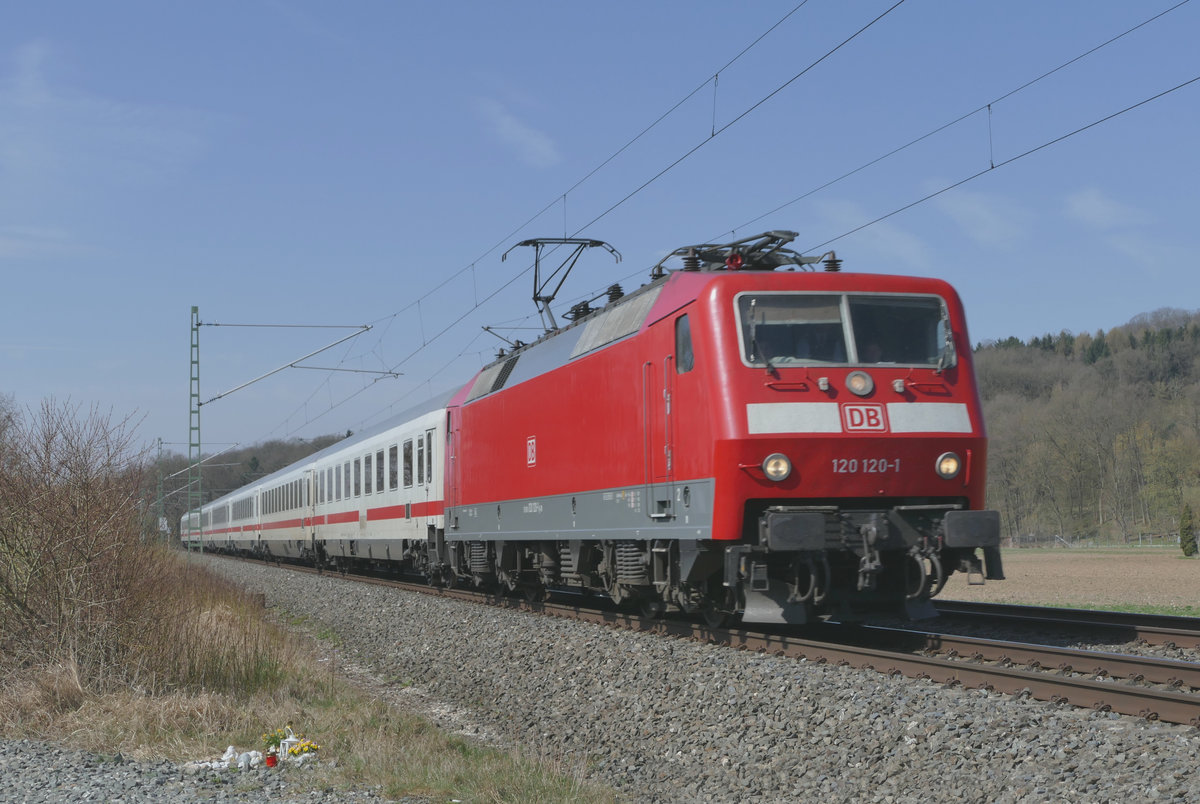 10. April 2018, Lok 120 120 mit IC 2063 Karlsruhe - Leipzig fährt am ehemaligen Haltepunkt Oberlangenstadt vorüber.