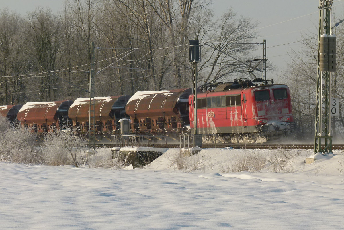 29. Dezember 2010, Eine Lok der BR 151 befördert bei -10°C bei Redwitz einen Güterzug aus Saalfeld in Richtung Lichtenfels. Eine weitere 151 schiebt nach. Beide Nummern waren nicht zu erkennen. Jürgen Krause