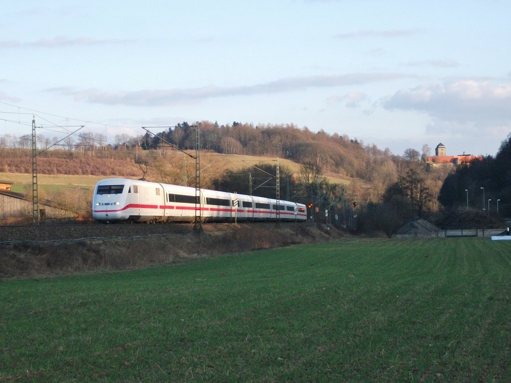 146 541, ein Euro-Express Wagen und 146 542 kehren am 19. März 2012 von Testfahrten auf der Frankenwaldrampe nach Kronach zurück. Aufnahme bei Knellendorf. Frankenwaldbahner