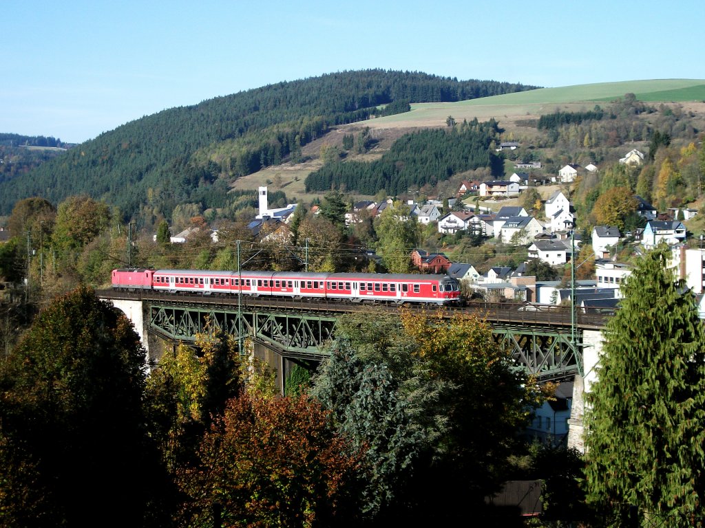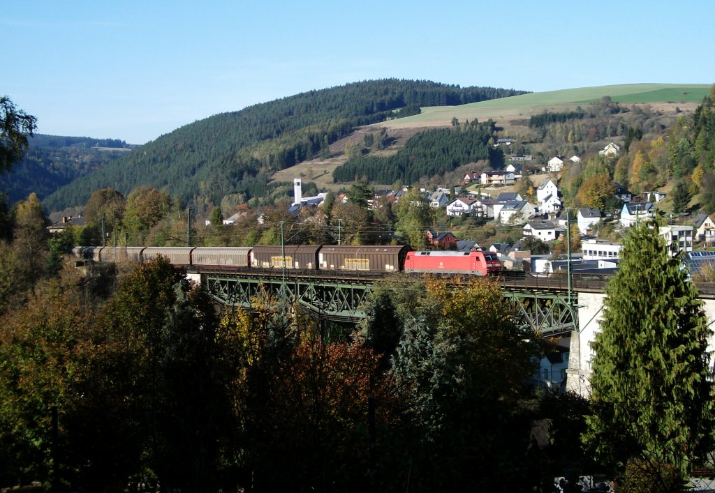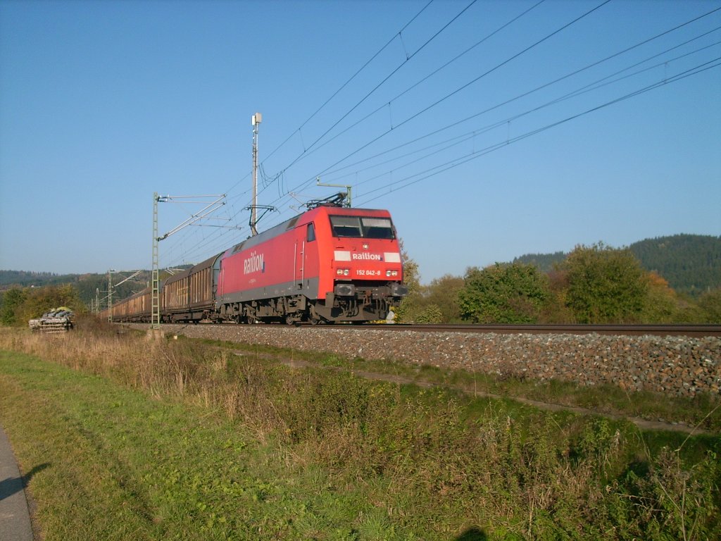 152 042-8 Railion ist am 23.10.2011 mit einem kurzem H-Wagenzug zwischen Pressig-Rothenkirchen und Stockheim auf der Frankenwaldbahn unterwegs. Alexander