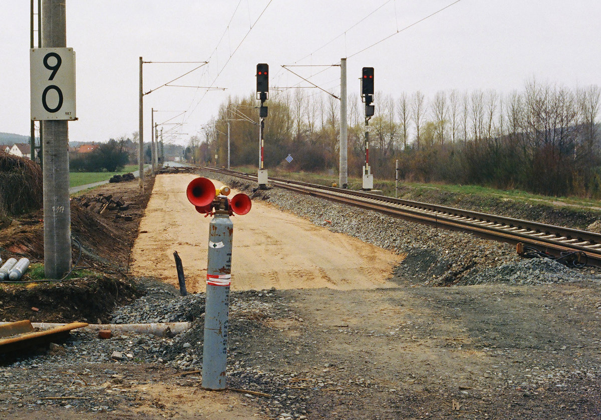 14. April 1995, Die Frankenwaldbahn bekommt ihr bis 1949 abgebautes zweites Gleis zurück. Das Foto zeigt das Planum bei Küps. Am heutigen Karfreitag ruhen alle Aktivitäten, auch der Warntyphon ist unbesetzt. Jürgen Krause