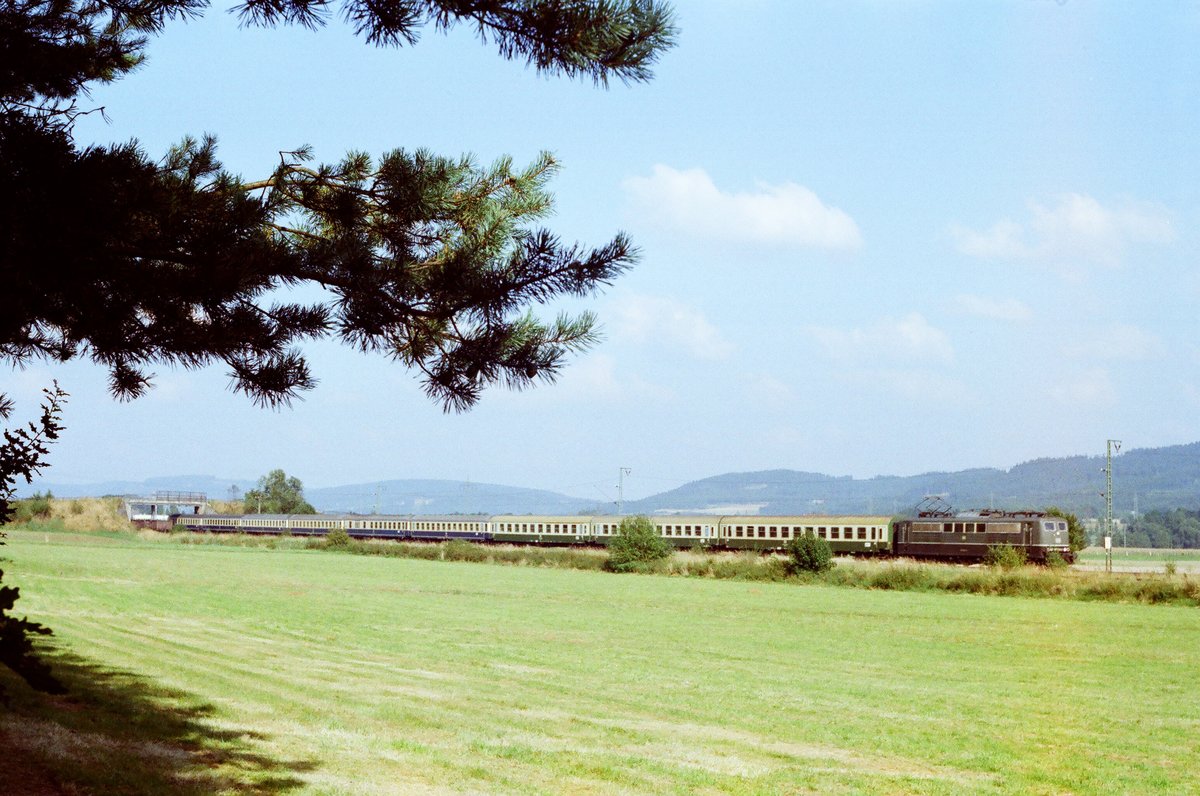 September 1987: D 403 Leipzig - Gera - Saalfeld - Nürnberg auf der Frankenwaldbahn bei Stockstadt, die grünen Wagen sind "Halberstädter" der Reichsbahn (DR) und kommen mit erwartungsvollen DDR-Bürgern (meist Rentnern) in den "Westen". Jürgen Krause