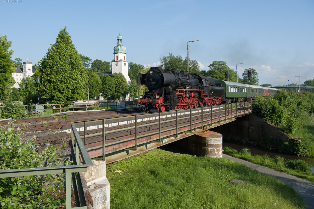 Die 612er und 641er haben auf den Relationen Hof - Lichtenfels und Hof - Bamberg ihre Einsätze getauscht. Die 612er laufen nach Bamberg, während die 641er nun meist in Doppeltraktion nach Lichtenfels unterwegs sind. 641 038 und ein Schwestertriebwagen haben vor wenigen Minuten Hof verlassen und brummen bei Oberkotzau an der (sächsischen) Saale entlang. - 19.05.2018 Erhard Pitzius