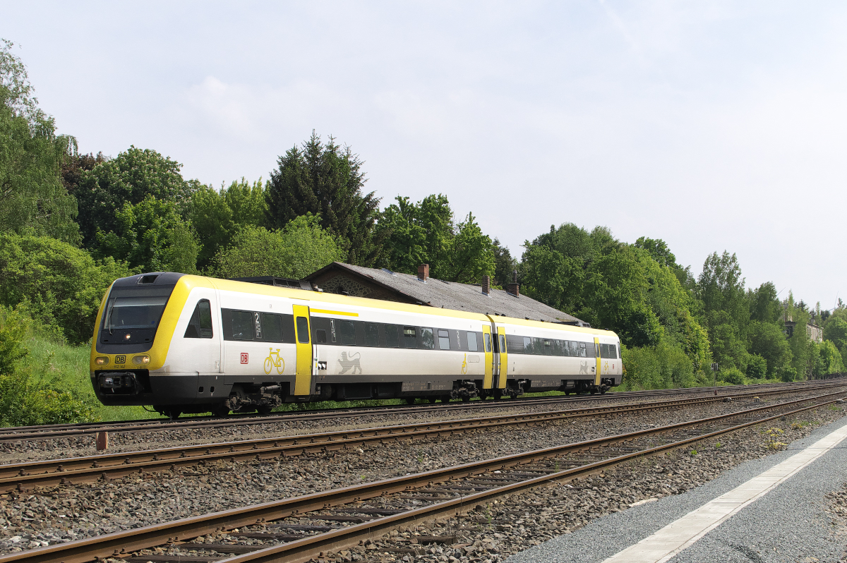 Ein paar Kilometer hinter der "Schiefen Ebene" ist 612 160 auf dem eingleisigen Streckenabschnitt zwischen Marktschorgast und Stammbach unterwegs. Der RE Bamberg - Hof fährt gleich am Sportplatz von Streitau, einem Ortsteil von Gefrees, vorbei. Streitau hatte früher selbst einen Bahnhof an der Strecke Falls - Gefrees. Die Strecke zweigte bei Km 86,4 von der Hauptstrecke ab und wurde 1993 stillgelegt und nach und nach abgebaut. 27.05.2018 Ivonne Pitzius