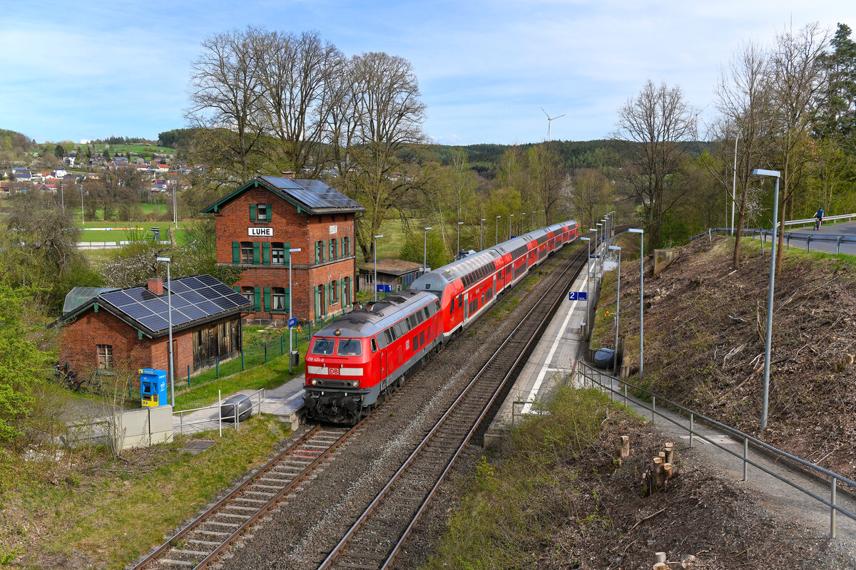 Am Nachmittag des 16. April 2025 durcheilte die 218 424 mit ihrem RE 4860 nach Hof den Haltepunkt Luhe mit seinem schön renovierten ehemaligen Empfangsgebäude. Leider hat das Wetter an diesem Tage nicht gehalten, was der Wetterbericht in Aussicht gestellt hatte. Christoph Schneider
