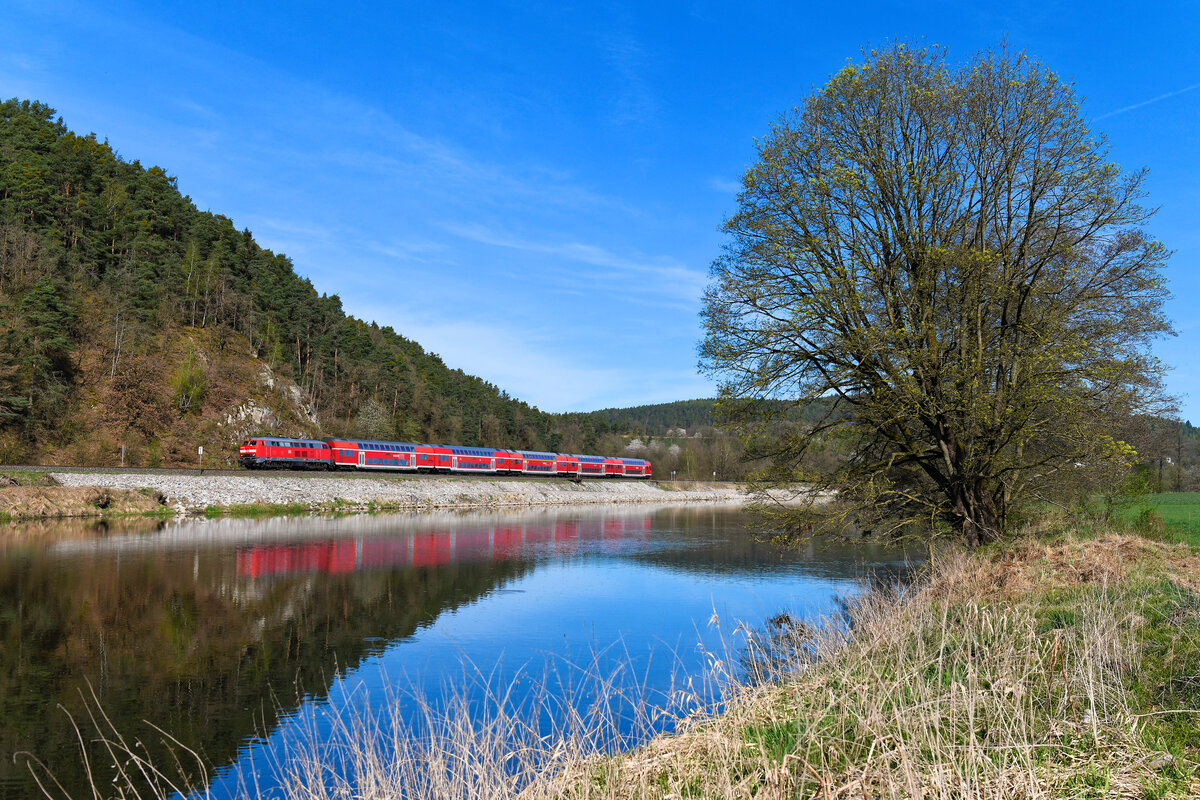 Am frühlingshaften 16. April 2025 zog die 218 424 den RE 4854 nach Hof. Bei Pfreimd spiegelte sich der Zug im Wasser der ruhig hinfließenden Naab. Leider zeigte sich der Himmel nicht so wolkenlos, wie am Vortage angekündigt. Christoph Schneider