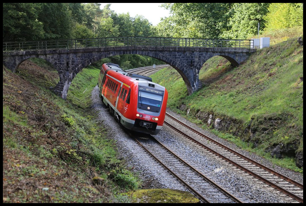 Im kurvenreichen Einschnitt bei Schnepfenberg ist hier am 16.9.2025 um 16.13 Uhr der VT 1648706 der Oberpfalzbahn nach Marktredwitz unterwegs. Gerd Hahn