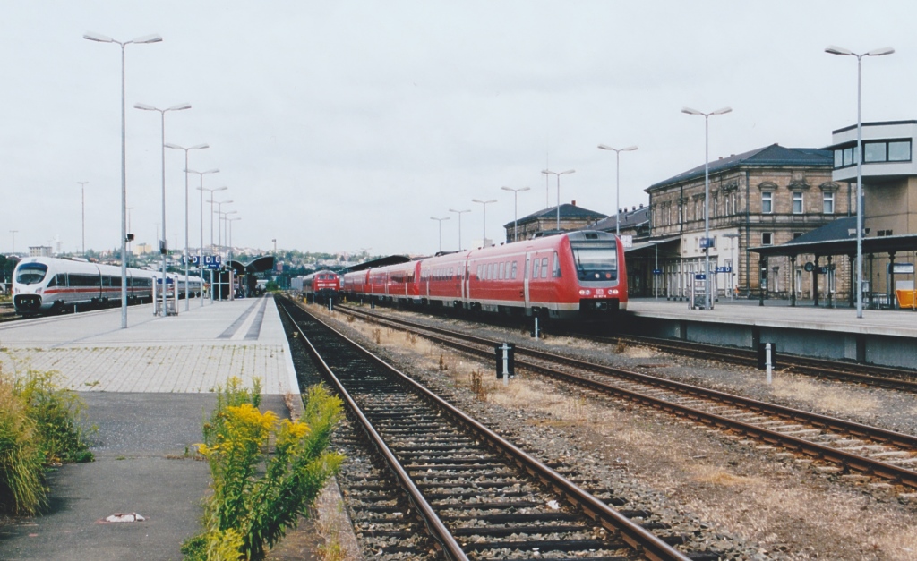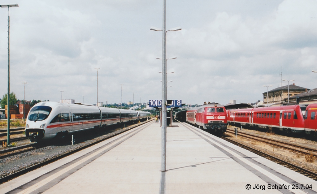 Der in Hof auf Gleis 10 hinterstellte „Diesel-ICE“ war 2004 schon nicht mehr im Planeinsatz und harrte einer ungewissen Zukunft. Die „Regioswinger“ (ganz rechts) hatten ihre Neigetechnikprobleme noch vor sich. Dazwischen die zuverlässige 218 383 mit einem RE nach Regensburg. Jörg Schäfer