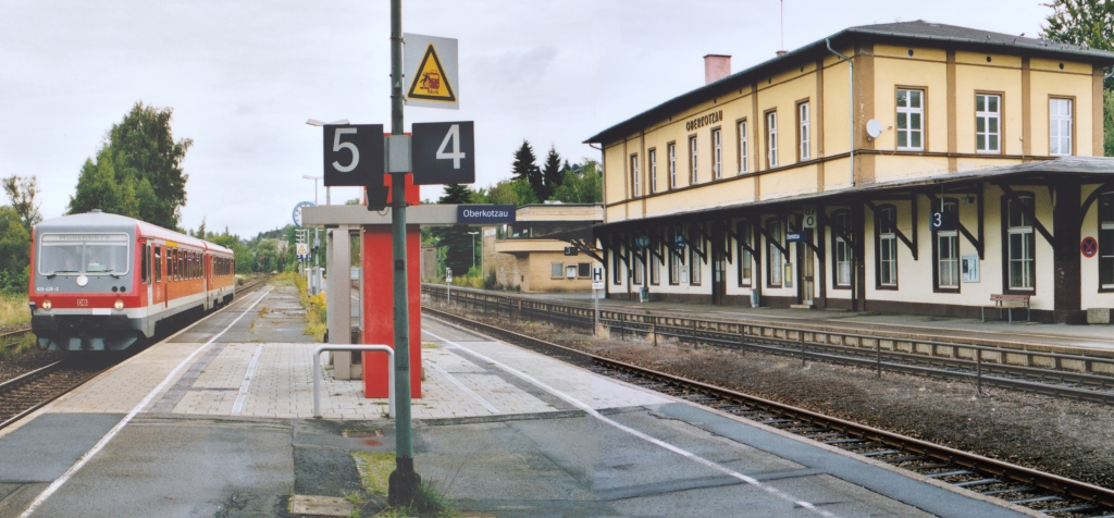 928 428 legte am 30.8.04 auf dem Weg nach Münchberg in Oberkotzau auf Gleis 5 eine kurze Pause ein. Das Empfangsgebäude machte noch einen recht ordentlichen Eindruck. Jörg Schäfer