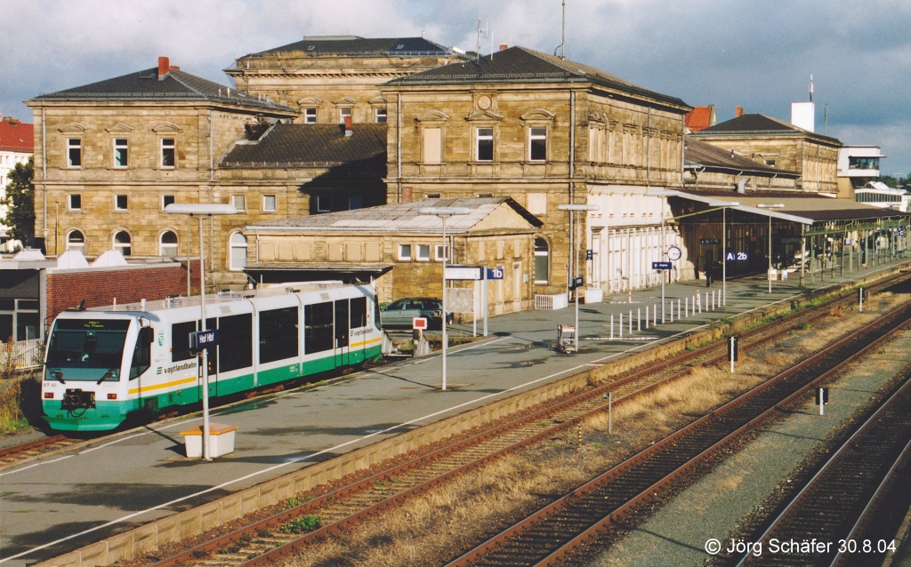 VT 12 der Vogtlandbahn hält am 30.8.04 als RB nach Hof in Oberkotzau auf Gleis 3. Der Bahnsteig wird noch von dem Vordach am Empfangsgebäude geschützt. Jörg Schäfer