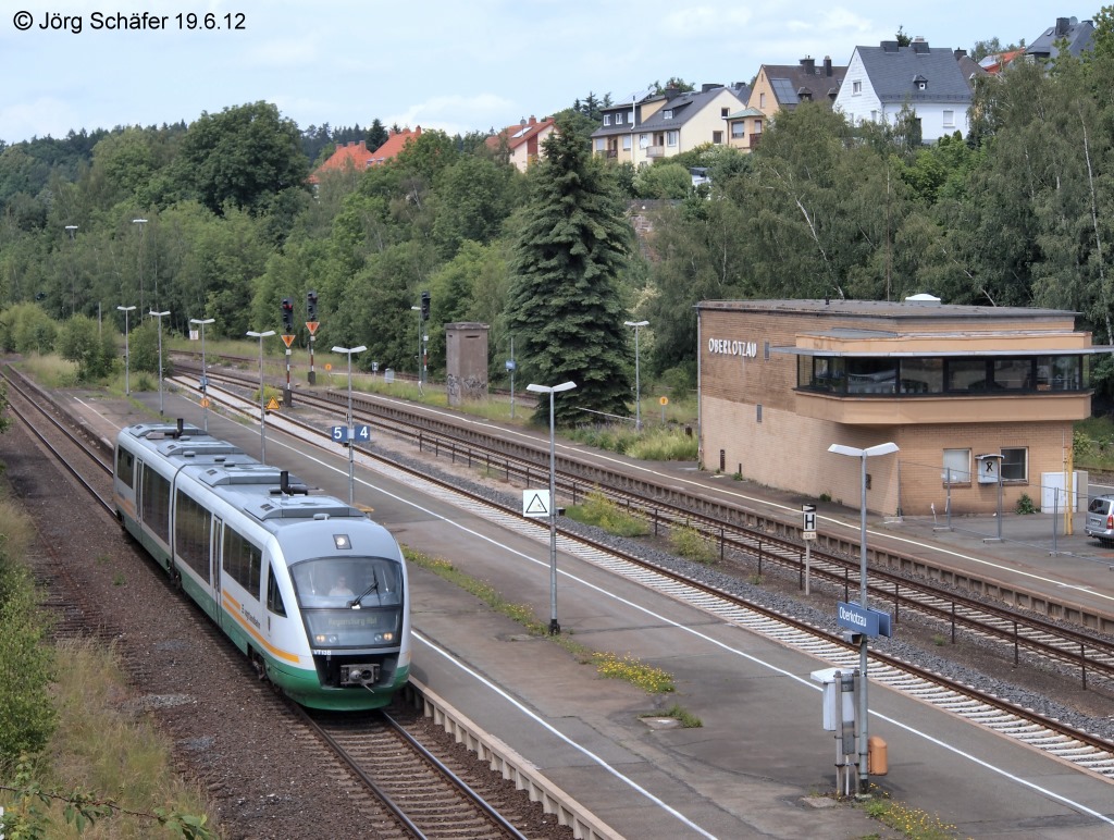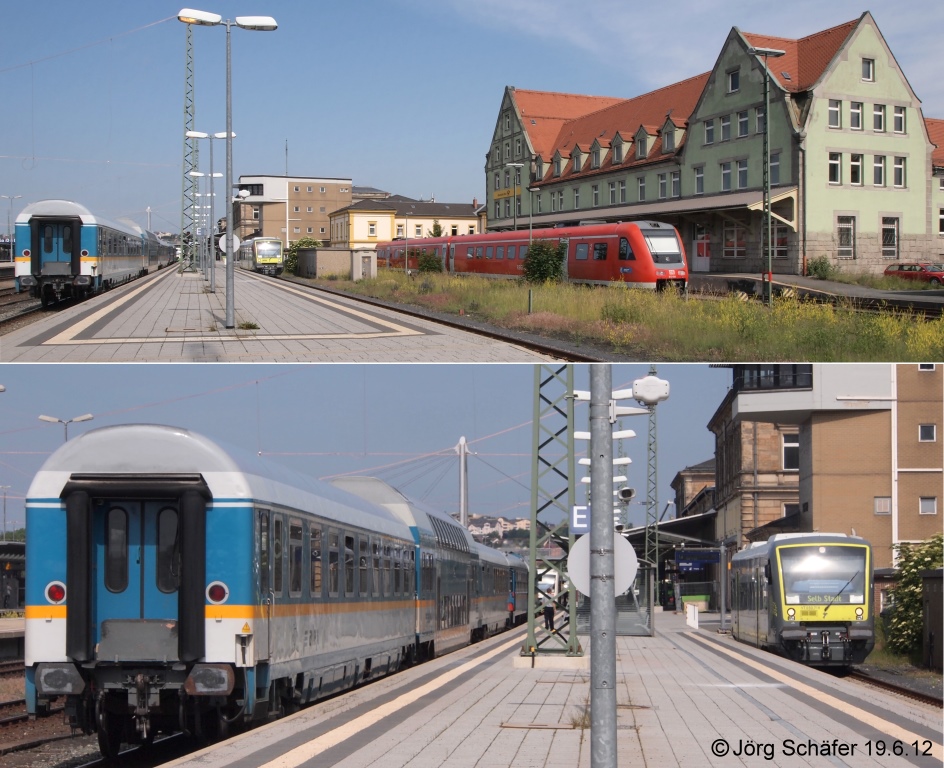Blick von der Straßenbrücke über den Bahnhof Oberkotzau nach Norden am 19.6.12. VT 13 der Vogtlandbahn hält als RB nach Regensburg auf Gleis. Das Empfangsgebäude macht ohne das Bahnsteigvordach einen desolaten Eindruck. Jörg Schäfer