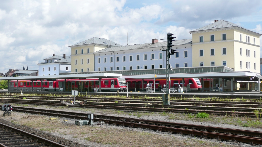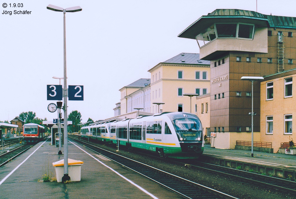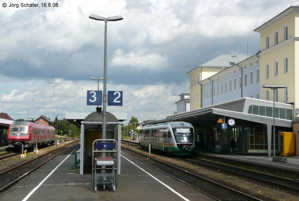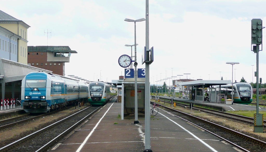 Blick nach Westen auf den Bahnhof Weiden am 18.8.08: 223 069 auf Gleis 1 brachte den "Alex" aus München, Arriva-VT 170 auf Gleis 2 fährt nach Hof und Arriva-VT 180 auf Gleis 6 nach Regensburg. Jörg Schäfer
