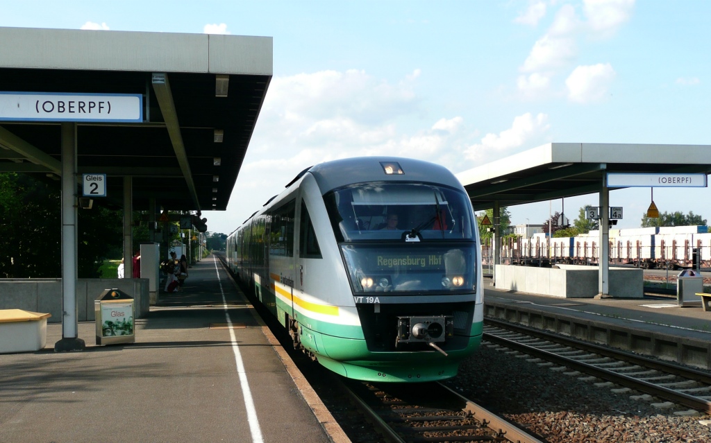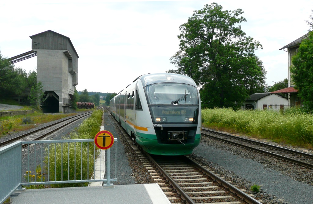 Arriva-VT 01 nach Regensburg erreicht am 6.7.11 den neuen Bahnsteig in Pechbrunn. Links die Verladeanlage des Basaltwerks, rechts hinter dem Baum versteckt sich das alte Empfangsgebäude Jörg Schäfer