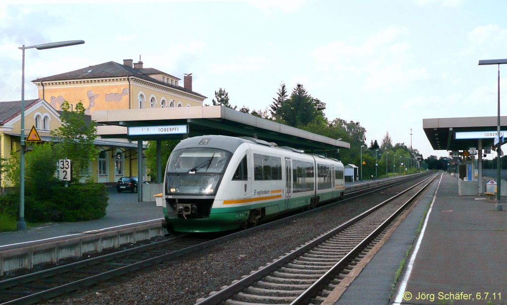 Arriva-VT 19 legt am 6.7.11 auf dem Weg nach Regensburg eine kurze Pause in Wiesau ein. Am rechten Bildrand erahnt man die große Gleisfläche östlich der Bahnsteige. Jörg Schäfer