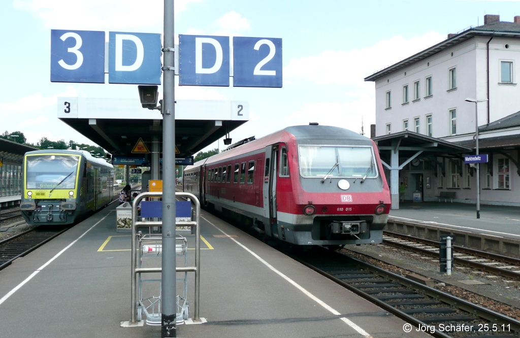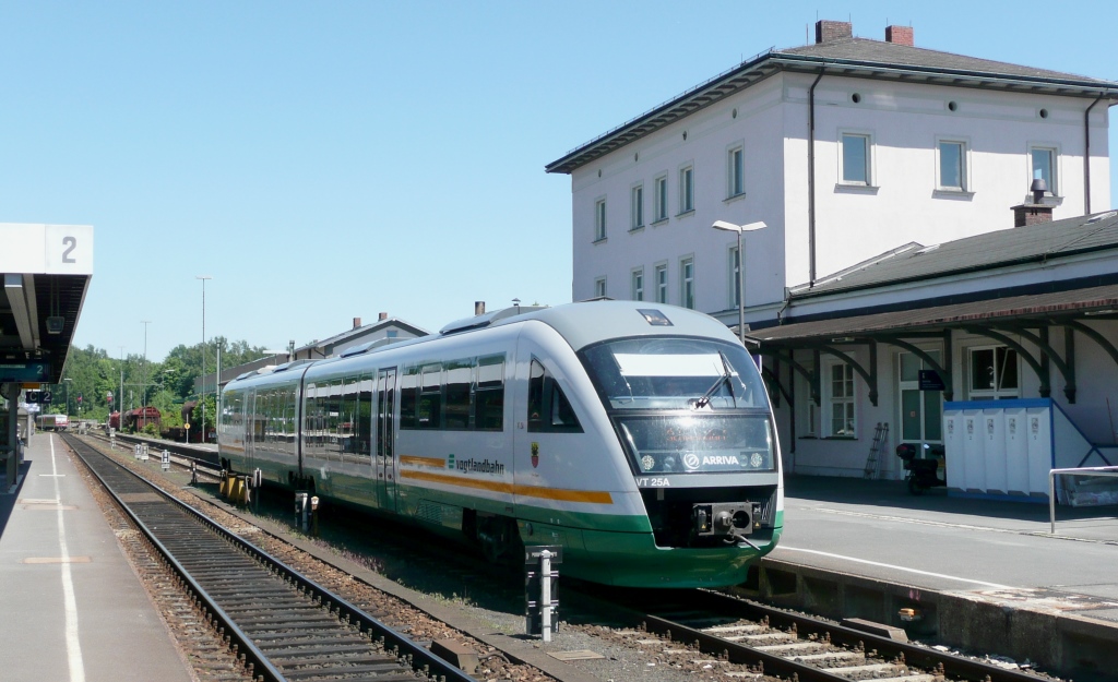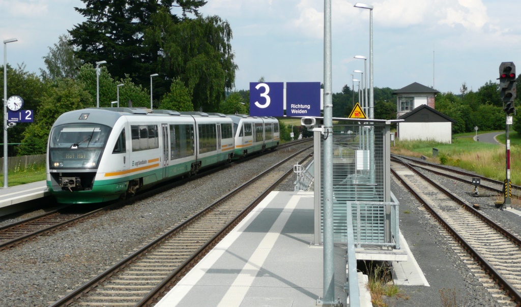 Arriva-VT 13 hält am 6.7.11 als nächste Regionalbahn nach Hof in Pechbrunn am neuen Bahnsteig. Rechts die beiden Gleise des Basaltwerks. Jörg Schäfer